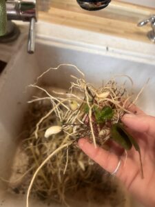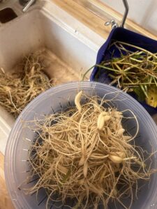 Parallel zum Basilikum habe ich noch Bärlauchwurzeln erhalten, die ich nun im ersten Schritt von Erde und anderen Wurzeln befreie.
