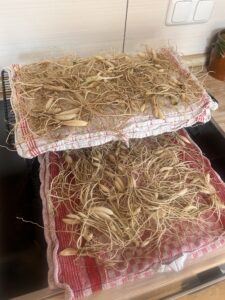 Nach der Auslese und Reinigung mit klarem Wasser werden die Wurzeln erst mal einen bis zwei Tage lang auf Küchentüchern und Kuchengitter ausgebreitet, damit sie trocknen.