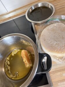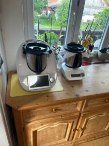 Als nächstes habe ich gleich noch einen Warmauszug mit dem Rest des Basilikum gemacht. Dies mache ich am liebsten im Thermomix, da ich damit über mehrere Stunden (ca.4h) bei gleichbleibender Temperatur (nicht über 60°C) halten kann, ohne danebenstehen zu müssen. Nach ein paar Stunden geht der Thermomix automatisch aus und ich lasse das Öl-Basilikum-Gemisch einfach im Mixtopf abkühlen. Nur das Küchenpapier wird von mir ausgetauscht, da sich darin die Feuchtigkeit sammelt. Den Vorgang wiederhole ich 3-4 Tage in Folge: erhitzen und wieder abkühlen.