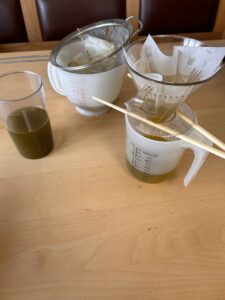 Wenn die beiden Öle nun fertig und abgekühlt sind, kann man es jeweils abseihen. Hier nimmt man ein feines Küchensieb oder auch Teebeutel oder Kaffeefilter.