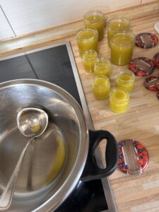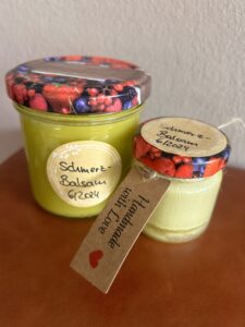 Ich habe jedoch so viel Öl gehabt, dass ich damit einige Gläser Balsam herstellen konnte. Also nahm ich noch Bienenwachs hinzu und Lanolin (Schafwollfett) und erhitzte in einem Wasserbad alles zusammen mit dem Öl und goss es in nach dem Vermischen direkt in Gläschen ab, die nun durch den Bienenwachs ein wenig haltbarer gemacht sind.