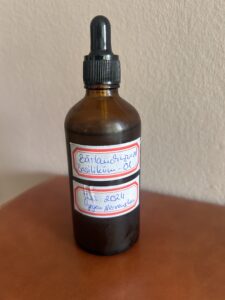 Als nächstes mischt man beide Öle: 2/3 Bärlauchwurzel und 1/3 Basilikum. Damit kann man dann 3-4x täglich die schmerzende Stelle einmassieren. Das Öl ist leider durch den hohen Wassergehalt der jeweiligen Pflanzen nicht so lange haltbar, daher sollte man es zeitnah aufbrauchen. Auch kann man die Haltbarkeit erhöhen durch kaltstellen im Kühlschrank.