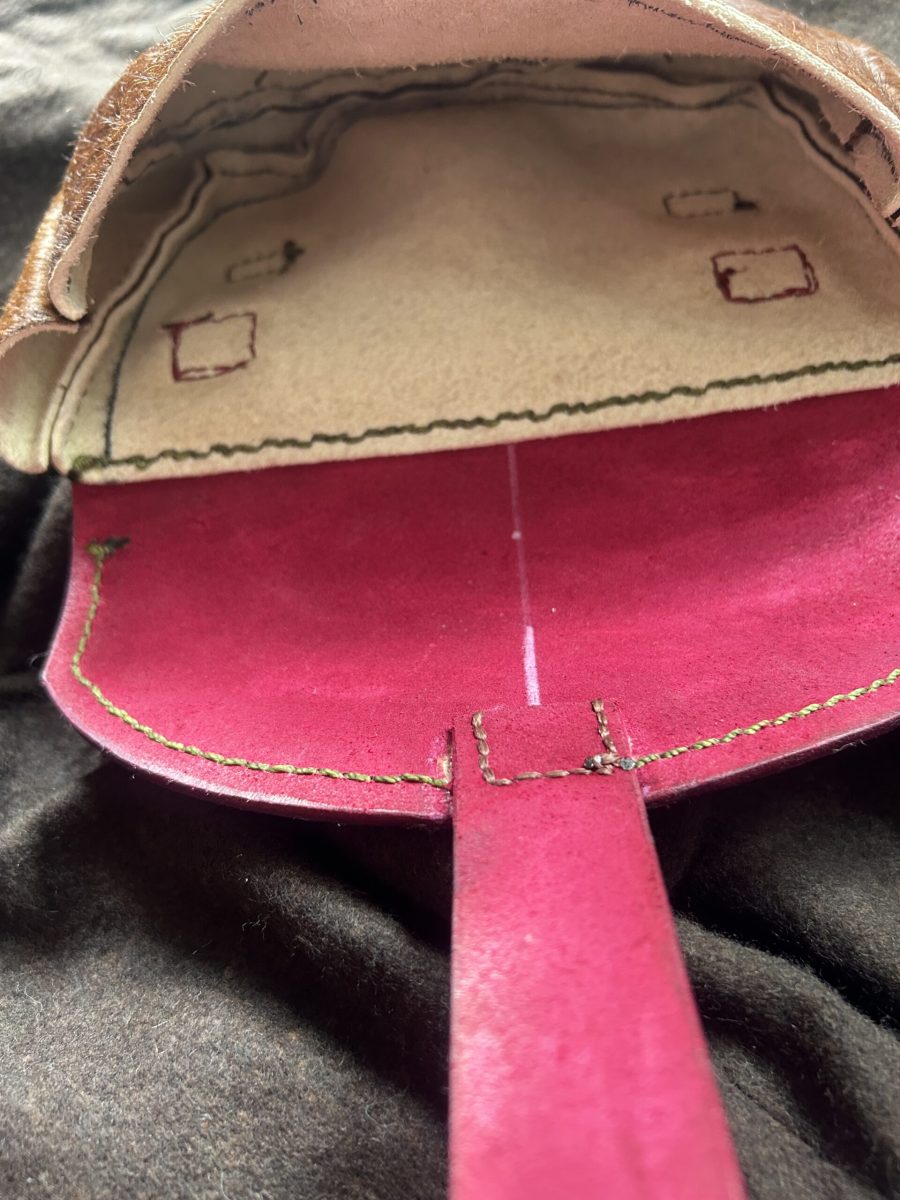 Da das Leder sehr hell war und nicht wirklich zum Rest des Gürtels und den Taschen passte, wurde noch mal nachgefärbt, so dass es nun ein Rotbraun mit einer Moos-grünen Ziernaht gab. Es wurde handgenäht.