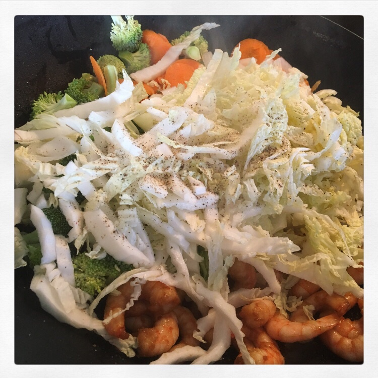 Wenn die dann gar sind, schiebt man sie zur Seite, gibt Zwiebeln, Karotten und Brokkoli dazu. Im Anschluss darauf kommt der Chinakohl und man würzt mit Salz und Pfeffer.